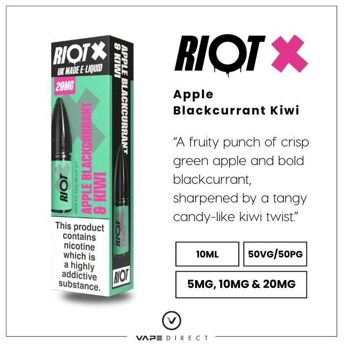 Experience a burst of summer with Apple Blackcurrant Kiwi by Riot X. This refreshing blend perfectly balances the taste of crisp apples with tangy blackcurrant notes and a hint of exotic kiwi for a truly fruity vape.