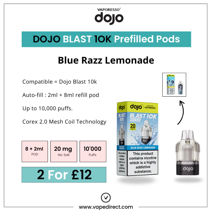 The Blue Razz Lemonade Vaporesso Dojo Blast 10K refill pack pairs sweet blue raspberry notes with a fizzy-tasting lemonade flavour.