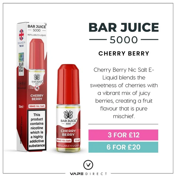 Cherry Berry nic salt e-liquid by Bar Juice 5000 delivers a bold, fruity vape experience. It fuses the juicy taste of ripe cherries with sweet and tangy notes of mixed berries for a perfectly balanced flavour profile.