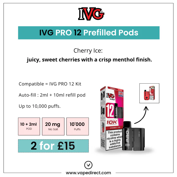 The Cherry Ice IVG Pro 12 refill pack muddles rich red cherry notes with cool ice for a fruity vape with a frosty finish. It's ideal if you like something sweet with a crisp endnote.