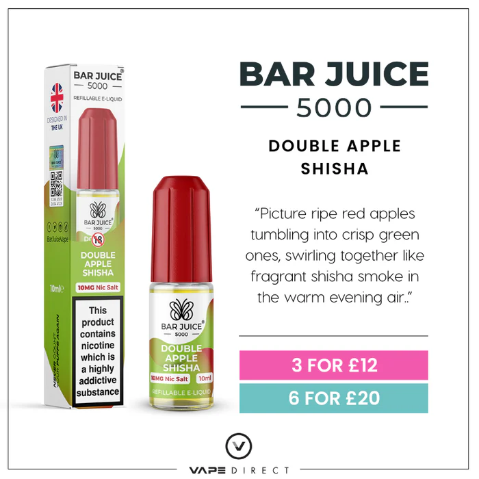 Double Apple Shisha nic salt e-liquid by Bar Juice 5000 offers a distinctive vaping experience, blending the flavours of crisp green apple and sweet red apple from inhale to exhale.