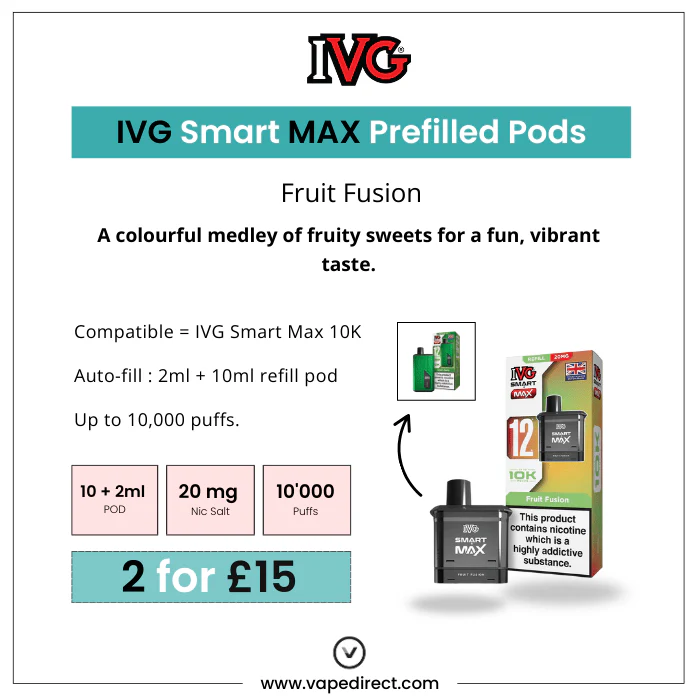 The Fruit Fusion IVG Smart Max refill pod combines sweet and tart notes of assorted fruit flavours, for a juicy-tasting vape.