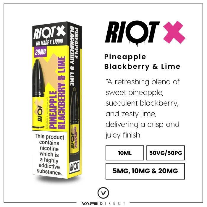 Experience a tropical explosion with Pineapple Blackberry Lime by Riot X. This punchy nic salt e-liquid delivers a complex fruit medley, layering sweet, tangy pineapple with juicy blackberry and a sharp, zesty lime finish.