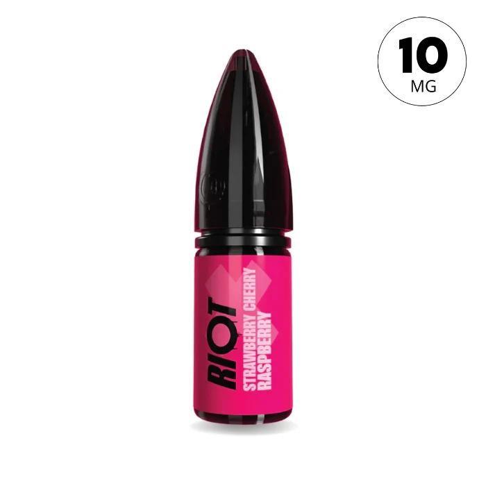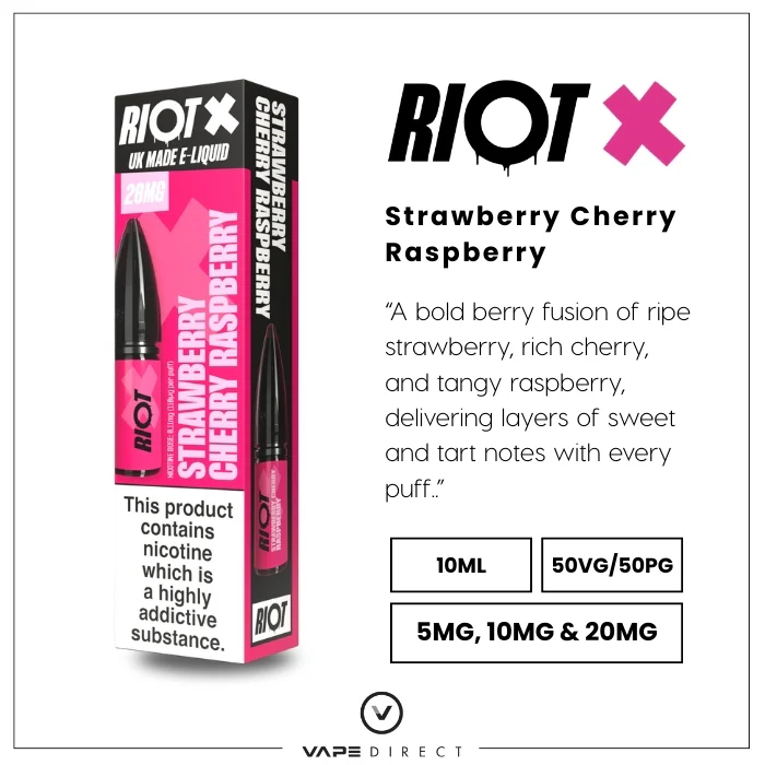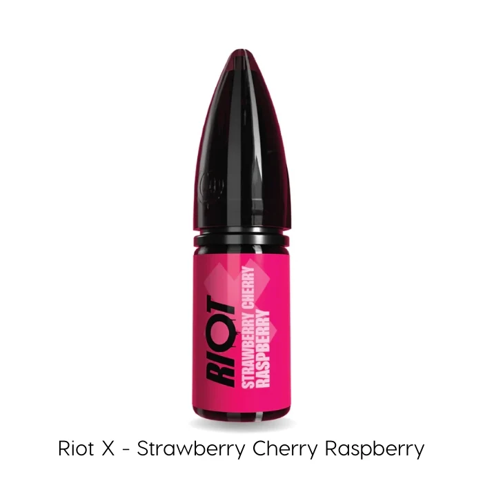 Experience a juicy berry fusion with Strawberry Cherry Raspberry nic salt e-liquid by Riot X. This blend features sweet strawberry layered with notes of dark cherry and tart raspberry for a balanced and flavourful vape.