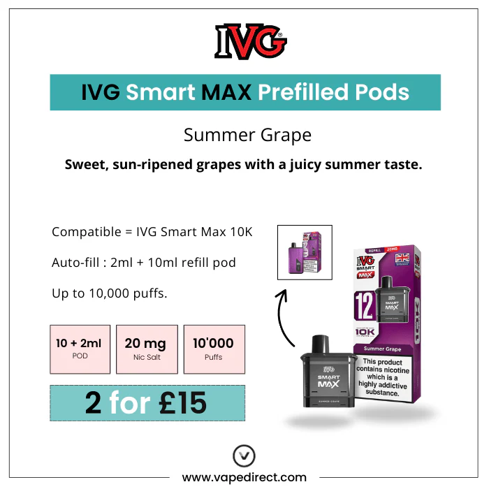 The Summer Grape IVG Smart Max refill pod is ideal if you prefer simple fruit blends. Sweet yet crisp notes of grape run throughout.