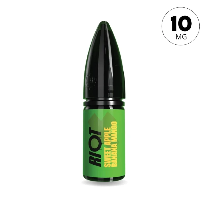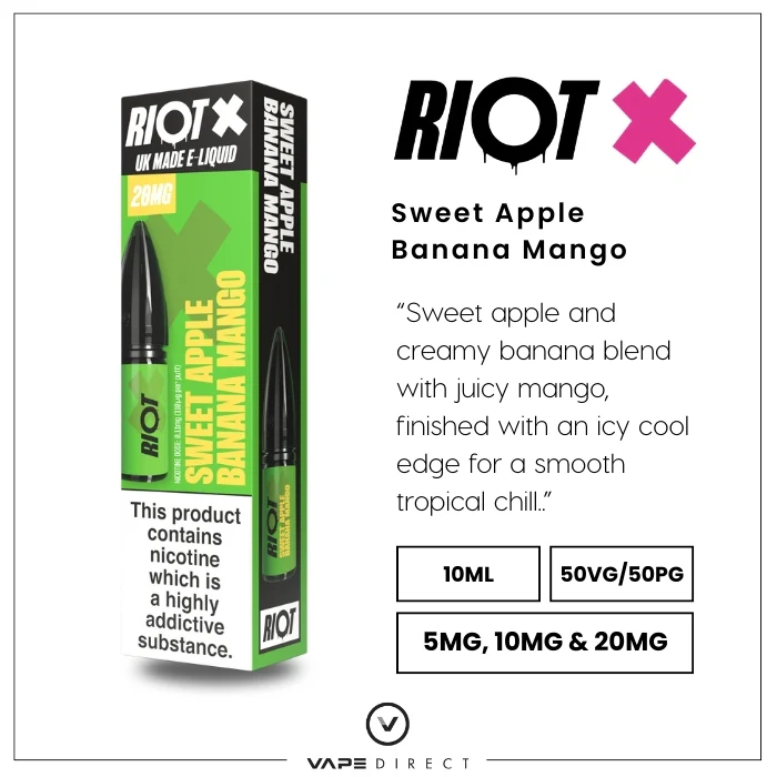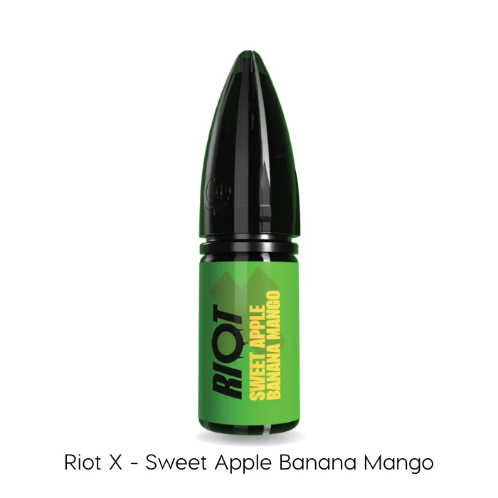Riot X's Sweet Apple Banana Mango nic salt e-liquid brings together a delightful mix of familiar and exotic fruits. It fuses the crisp taste of sweet apple with the juiciness of mango and the tropical smoothness of banana.