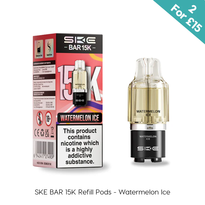 The Watermelon Ice SKE Bar 15K refill pods offers a crisp and sweet frozen fruit blend. It features a tropical watermelon flavour on the inhale, which is perfectly balanced by a cool blast of ice on the exhale.